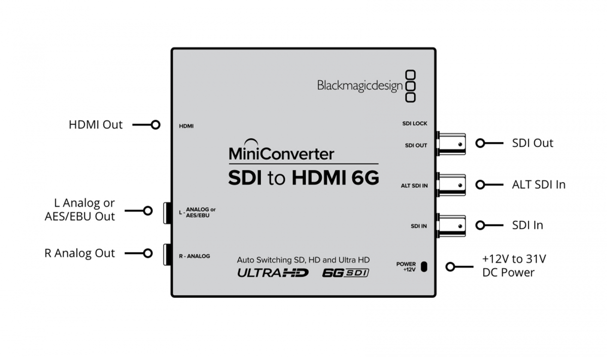 Mini Converter SDI to HDMI 6G; SD, HD, 3G Level A veya Level B ve 6G-SDI video kaynaklarından SD, HD ve Ultra HD video formatlarında HDMI'ya dönüşüm yapabilmeniz için ihtiyacınız olan herşeyi içerir. Ayrıca, SDI gömülü sesi HDMI, AES/EBU ya da dengeli ses çıkışına ayrıştırabilirsiniz. Ayrıca HDMI çıkışında anında kilitleme özelliğini de içerir. Yayın izleme için büyük ekran Ultra HD TV ve projektörler kullandığınızı düşünün! Dahili alt çevirici HD televizyonlarında bile Ultra HD izleme imkanı veriyor!