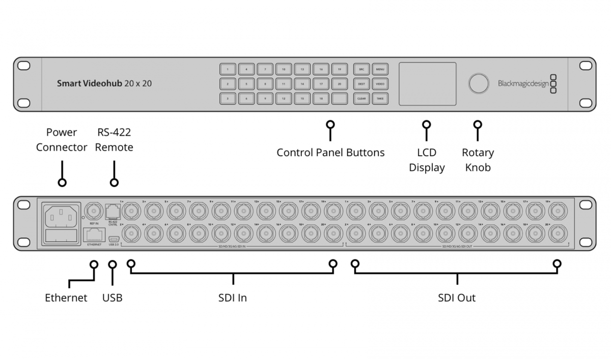 Smart Videohub 20 x 20 dahili kontrol panel ve izleme özelliklerine sahip çok daha ileri Ultra HD karışık format yönlendiricidir. Daha büyük çalışma grupları ve stüdyo dışı yayıncılık için idealdir, ileri 6G-SDI bağlantılar içerir, böylece aynı anda aynı yönlendiricide SD, HD ve Ultra HD video'nun her türlü kombinasyonunu eşzamanlı olarak bağlayabilir ve yönlendirebilirsiniz. Ayrıca eşsiz döndürmeli düğme kontrol, bastırmalı buton panel ve dahili LCD ekran özellikleri ile devrim yaratan yeni görsel yönlendirmeye sahip oluyorsunuz.