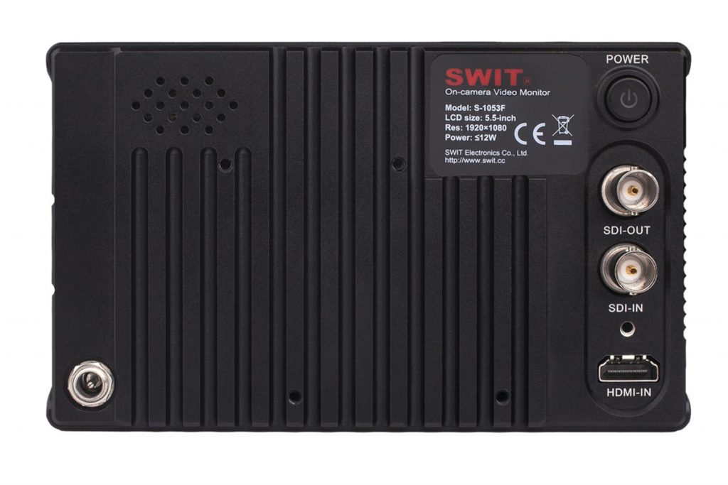 S-1053F gelen SWIT 1 ve ° / 160 ° 160 görüş açısı: LED arka plan ve 1920 x 1080 doğal çözünürlük, 1000 kontrast bir 5.5” LCD paneli benimser. Dış mekan kamera üzeri video izleme için uygun alüminyum alaşımlı, daha ince ve sağlam bir muhafazaya sahiptir. Monitör yerleşik HDMI'dan SDI'ya dönüştürmeyi destekler ve ayrıca bir SDI döngü çıkış bağlantı noktasına sahiptir. 5.5 mm kilitlenebilir DC soket aracılığıyla 6.5 ila 24 VDC girişi destekler ve DV pillerle çalıştırılacak bir S-7003B Panasonic VW Pil Plakası ile birlikte gelir.